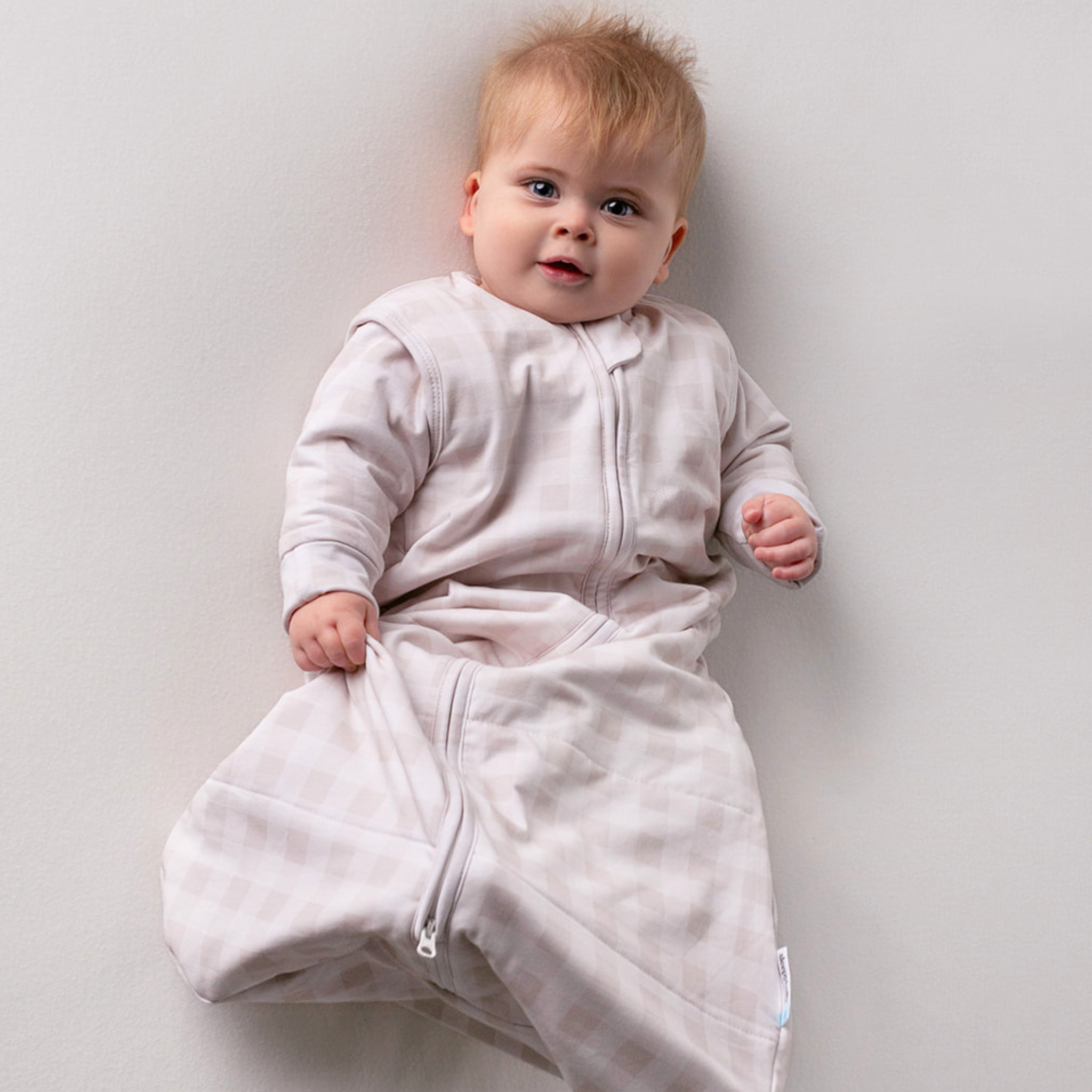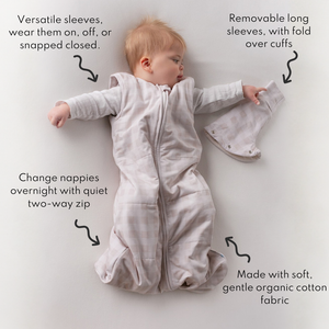 Use sleeves to match the room, not a fixed rule. In cooler rooms, keep sleeves on. In warmer rooms, take sleeves off. Check your baby’s chest or the back of the neck to judge comfort, warm is right, hot or sweaty means remove a layer. Follow TOG guidance, lower TOG for warm weather and higher TOG for cool weather.