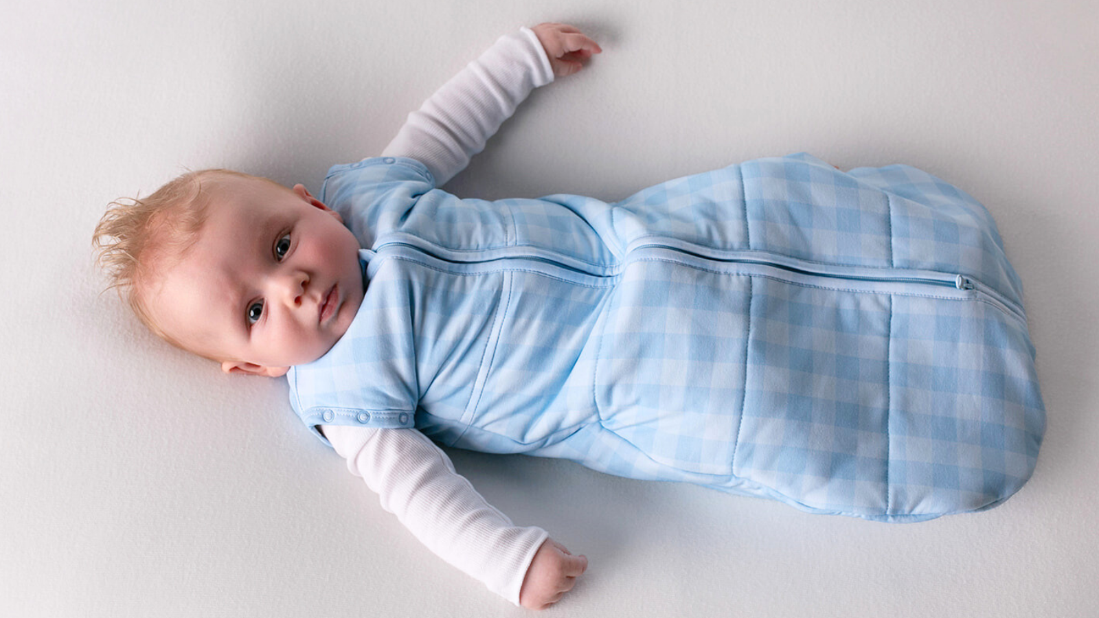 • Arms-out (transition): When baby shows signs of rolling (often around 8–12 weeks), open one or both armholes for safe arms-out sleep.