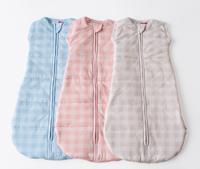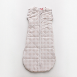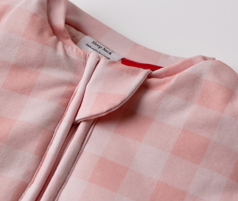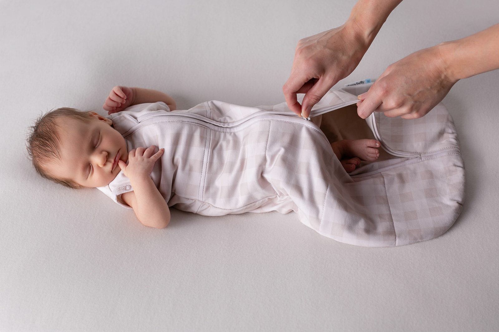 Close-up of a person adjusting the waistband of a beige gingham quilted sleep sack.
