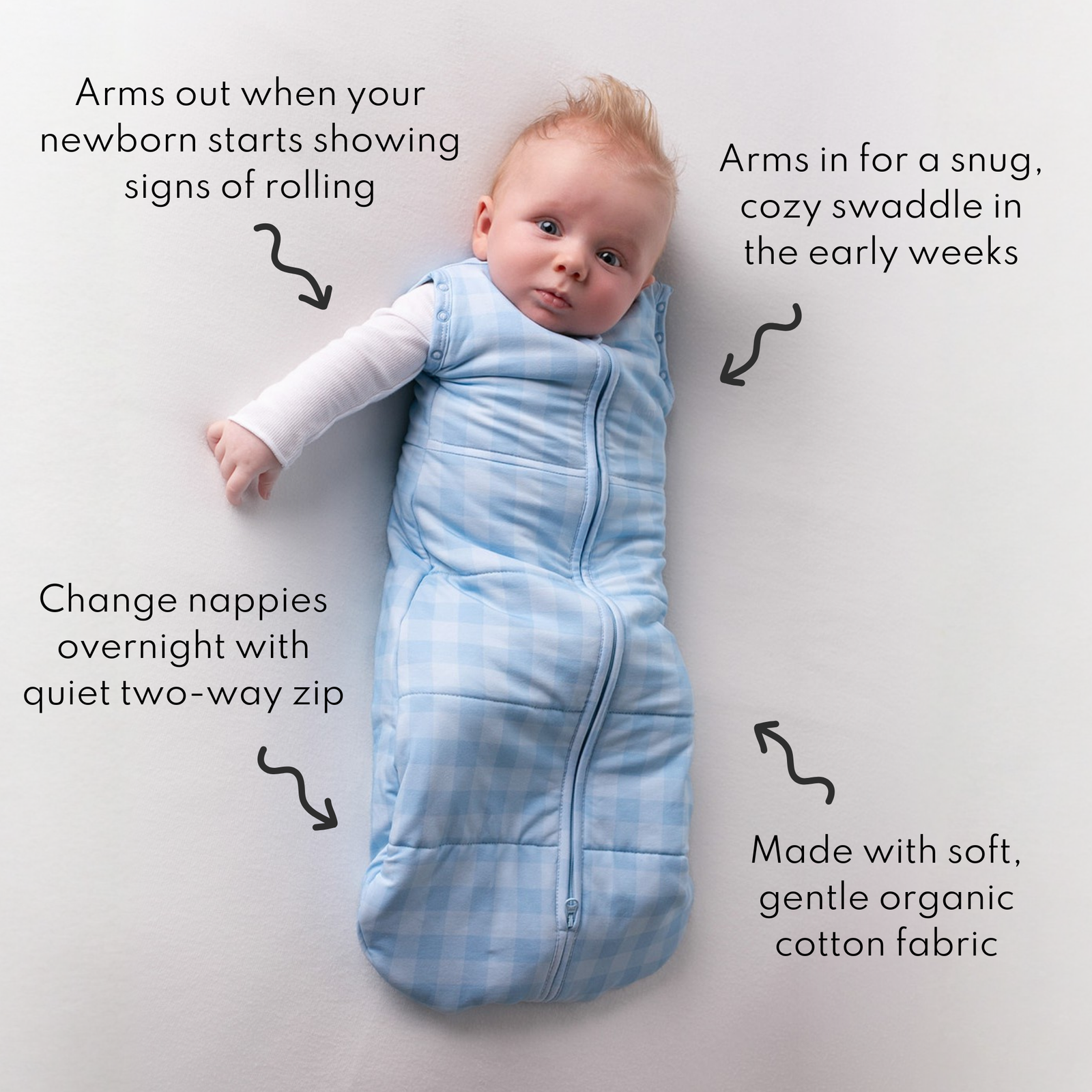• Arms-in (newborn): Close all 3 press-studs for a snug, womb-like feel. Zip up all the way and tuck the soft zip cover under the chin.